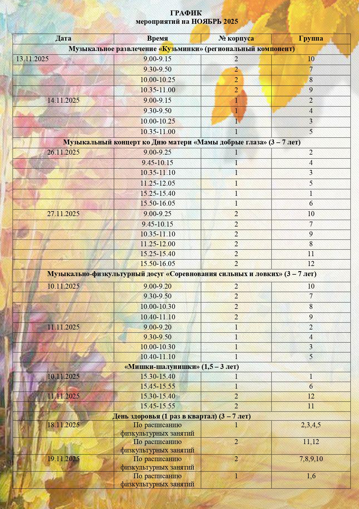 График мероприятий на ноябрь