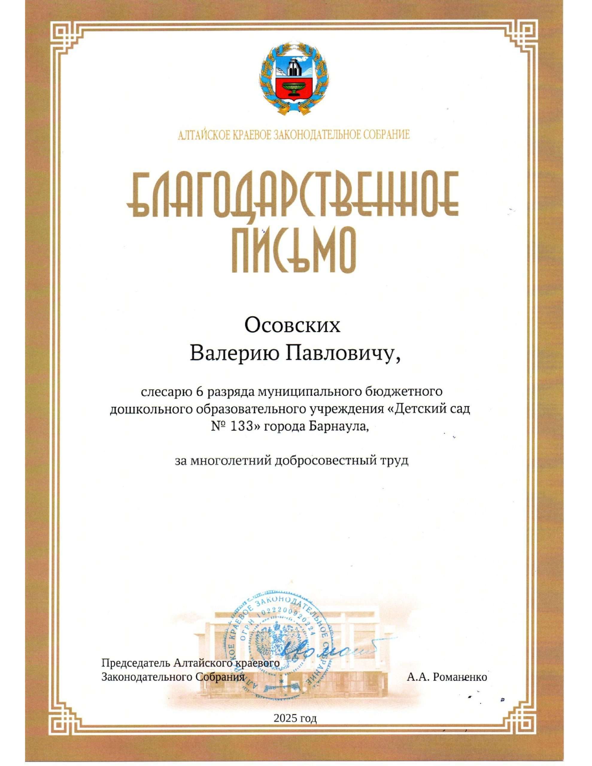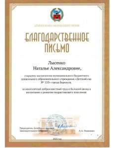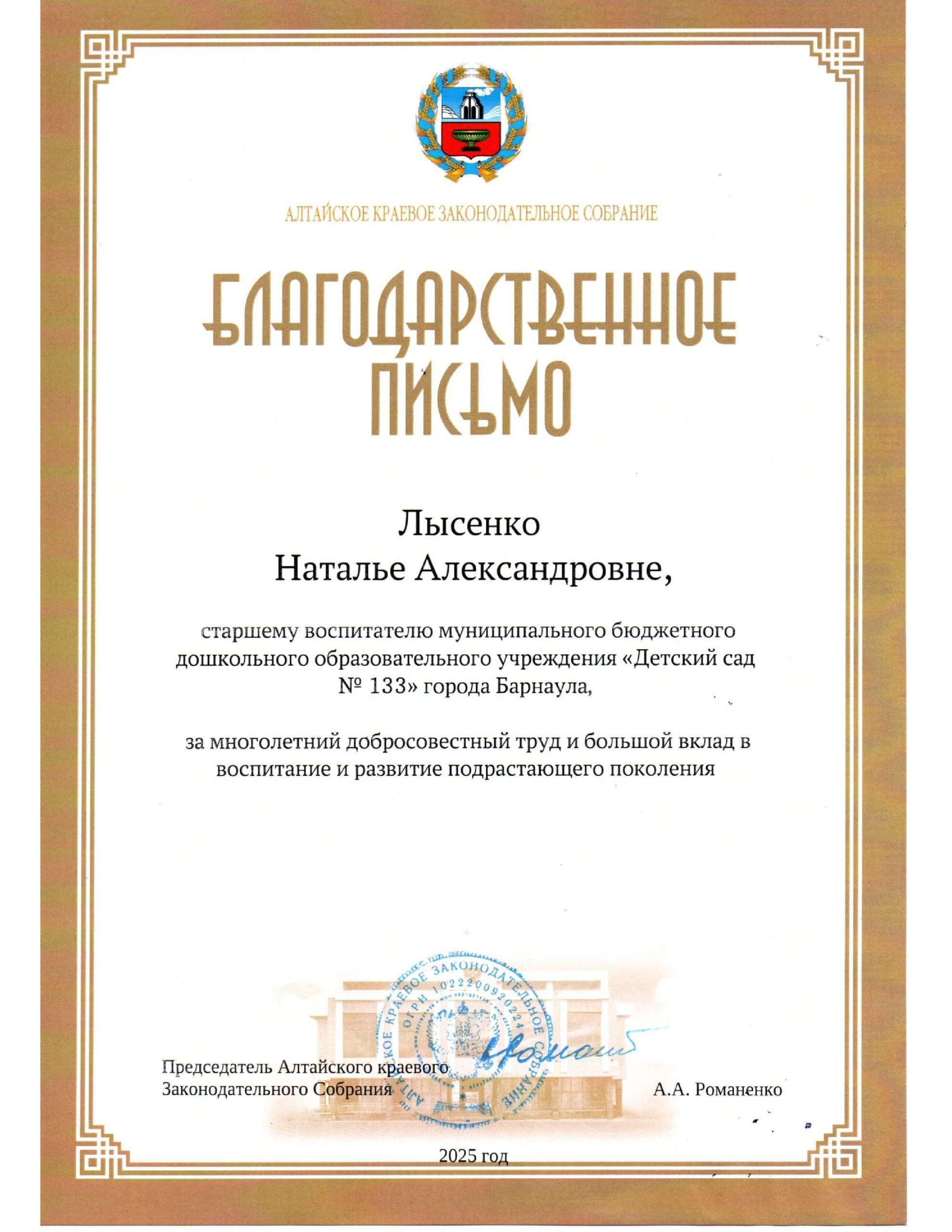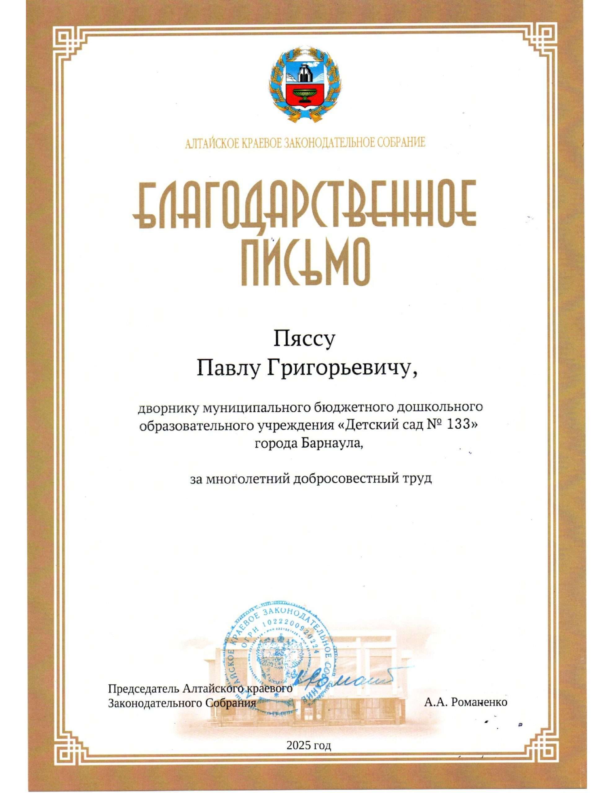 Наталья Лысенко, старший воспитатель, Павел Пясс, дворник, а также Валерий Осовских, слесарь 6 разряда — отмечены Благодарственным письмом Алтайского краевого Законодательного Собрания.