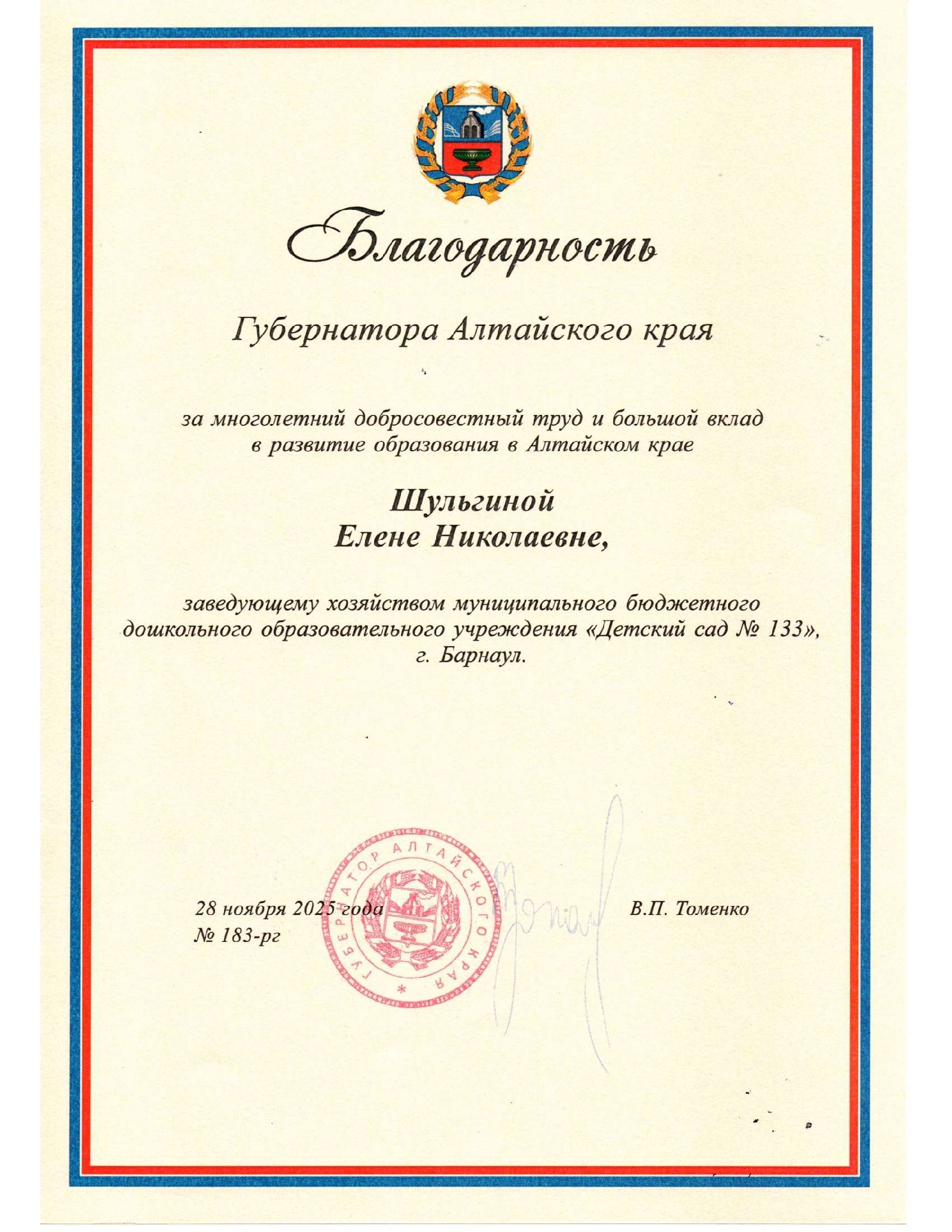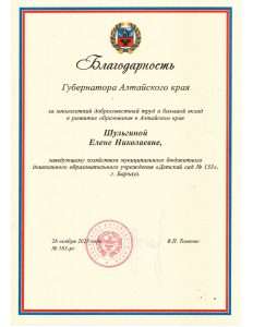Елена Шульгина, заведующий хозяйством — получила Благодарность Губернатора Алтайского края.