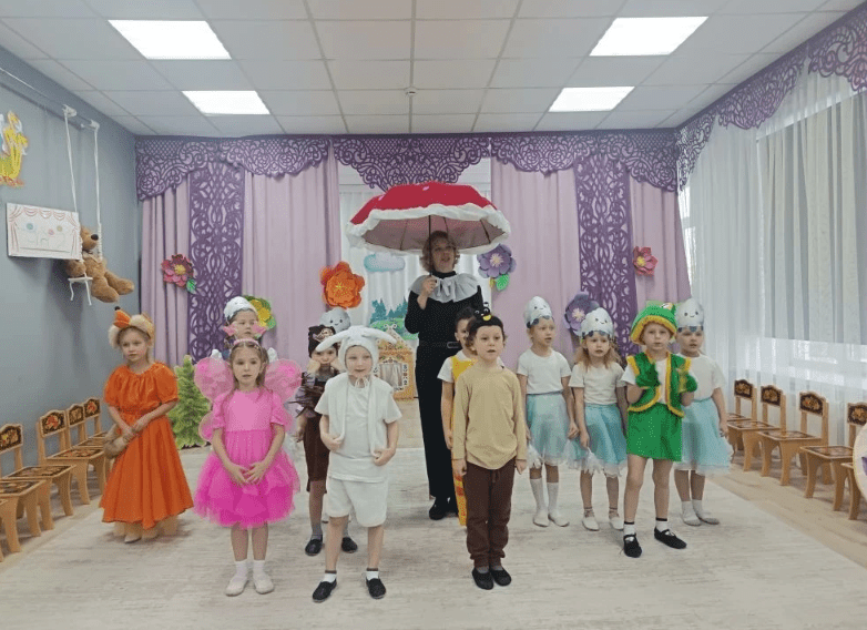 - старшая группа № 3порадовала трогательной постановкой «Под грибом» по мотивам сказки В. Сутеева;